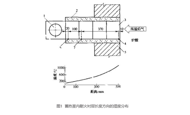 粒状陶瓷纤维浇注料,同重质耐火浇注料一样耐高溫、高强度和高温下的低收缩率,又有轻质隔热浇注料的低热导率和高抗热震性。粒状陶瓷纤维浇注料热导率接近于轻质隔热砖。大多轻质隔热浇注料其使用温度低、强度小。抗热震性在1150℃水 冷50次不断裂,仍保留有40%左右剩余强度,适应了温差大的耐火隔热层断面,也适应了蓄热室在长度方向的高温差。图1示出了蓄热箱耐火衬在长度方向上的温度分布。